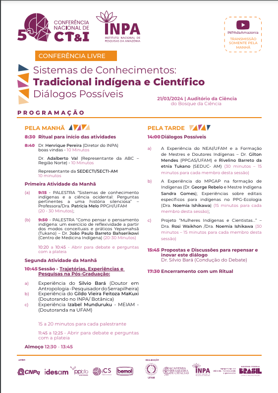 O Instituto Nacional de Pesquisas da Amazônia (Inpa/MCTI) realizou, na quinta-feira (21) a Conferência Livre “Sistemas de Conhecimentos: tradicional indígena e científico – Diálogos Possíveis”. O evento integra as preparatórias da V Conferência Nacional de Ciência, Tecnologia e Inovação, que acontecerá de 04 a 06 de junho, em Brasília-DF, com a finalidade de definir a estratégia de política científica do Brasil.